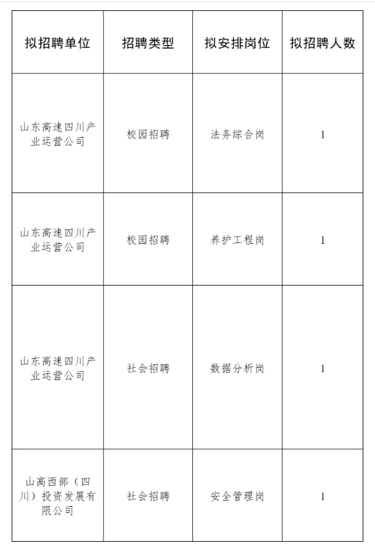 本次公开招聘工作人员4名,其中校园招聘2名、社会招聘2名。具体岗位及招聘条件详见附件:《山东高速四川产业发展有限公司2025年下半年招聘岗位明细表》。