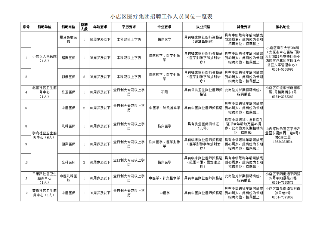 太原市小店区医疗集团于2019年1月4日正式启动,集团拥有先进的医疗设备和专业的医疗团队,致力于为患者提供优质的医疗服务。集团下属的社区卫生服务中心、乡镇卫生院是集预防、医疗、保健、健康教育、康复、计划生育指导于一体的社区卫生服务机构。为进一步加强集团医疗人才队伍建设,适应集团发展的需求,切实为人民健康提供服务和保障,根据集团不同发展需求,面向社会公开招聘。