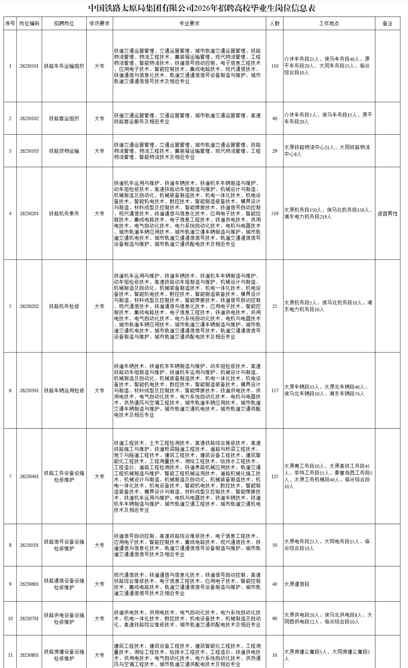 中国铁路太原局集团有限公司根据企业发展需要,现将2026年全日制普通高等职业院校高职(大专)毕业生招聘有关事项公告如下。