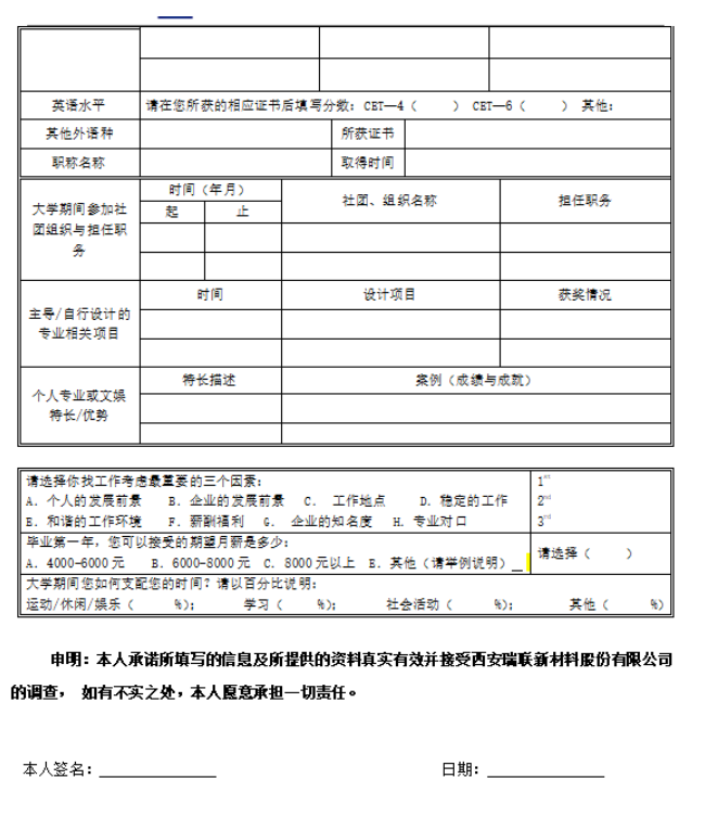 1、请填写西安瑞联新材料股份有限公司2026届校园招聘入职申请表(详见附表一),按照固定模板表格进行填写投递。