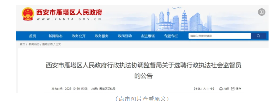 为拓宽行政执法监督渠道,充分发挥行政执法社会监督员对行政执法机关和行政执法人员的社会监督作用,推动社会监督与行政执法监督有机结合,根据中央和省市区法治政府建设总体要求,以及《西安市人民政府办公厅关于进一步规范行政执法行为提升行政执法能力的实施意见》(市政办〔2022〕40号)安排,决定面向社会公开聘请雁塔区行政执法社会监督员。现就有关事项公告如下: