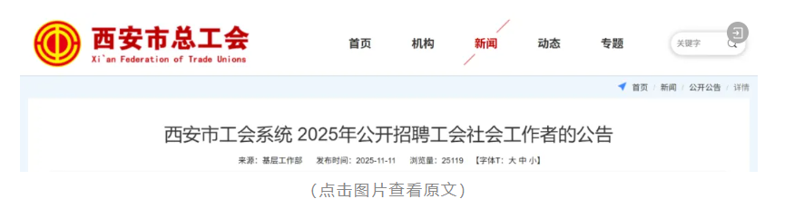 为进一步加强全市工会系统工作力量,根据《西安市工会社会工作者管理办法》等规定,现就西安市工会系统2025年公开招聘工会社会工作者有关事项公告如下。