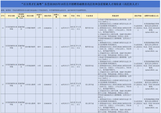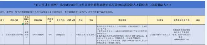 1.“百万英才汇南粤”东莞市2025年10月公开招聘基础教育高层次和急需紧缺人才岗位表