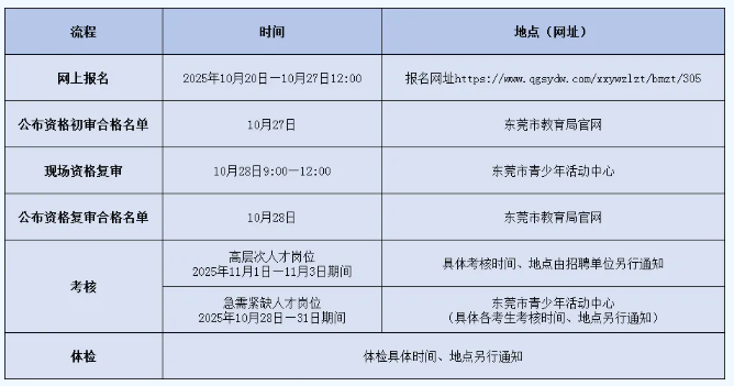 2025年10月20日—10月27日12:00网上报名。考生于10月22日—10月27日登录系统查看初审结果,通过初审入围复审阶段的人员名单于10月27日在东莞市教育局官网公布。
