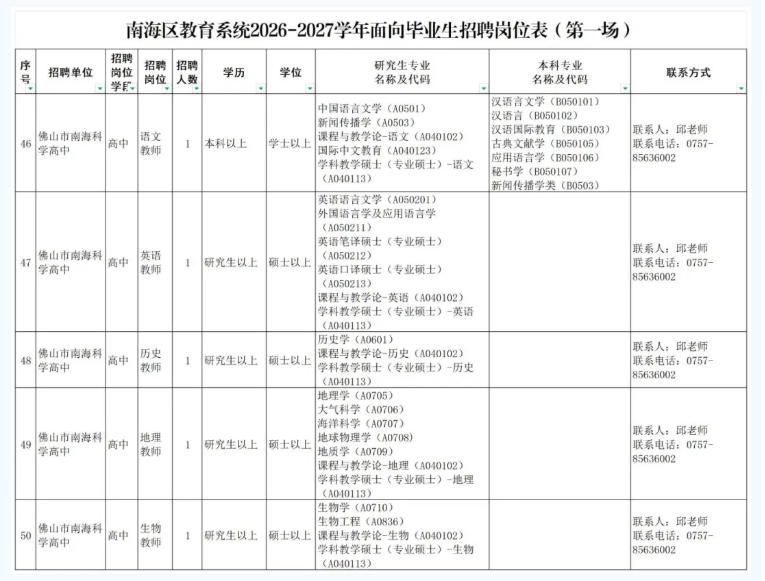 本次共招聘事业编制教师145人,岗位详见《广东省佛山市南海区教育系统2026-2027学年面向毕业生招聘教师岗位表(第一场)》(附件1),其中里水招聘5人。