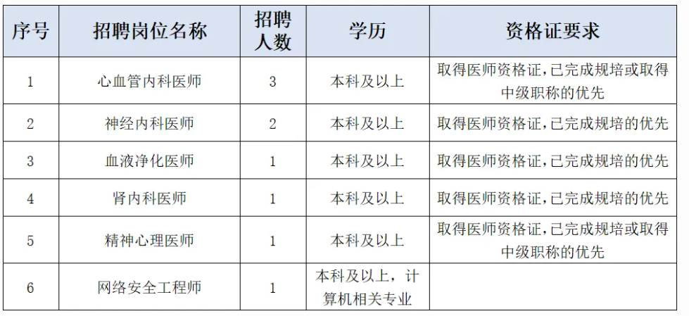 3.应聘者须按期取得相应岗位要求的学历学位证书和资格证书,医师岗位同时要求具有执业医师执业证书。个别岗位有特殊要求的,详见招聘岗位表。