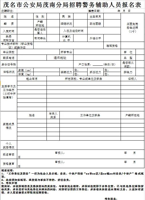 (1)《茂名市公安局茂南分局招聘警务辅助人员报名表》(附件2图片需另存下载打印,内容需手写,粘贴彩色证件照,签名需手写);