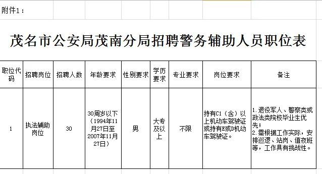 因工作需要,根据《广东省公安机关警务辅助人员招聘办法(试行)》有关规定,按照公开、平等、竞争、择优的原则,茂名市公安局茂南分局现面向社会公开招聘勤务类警务辅助人员30名(男性)。