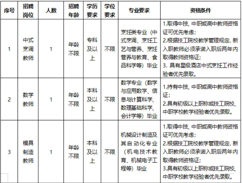 本次招聘编外合同制人员共3人,其中中式烹调教师1人、数学教师1人和模具制造教师1人。具体条件如下: