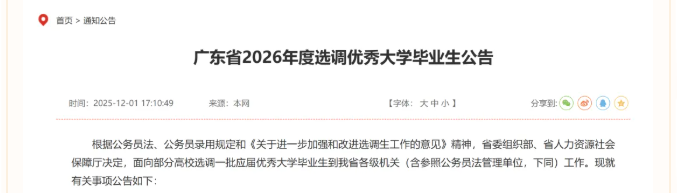 12月1日,《广东省2026年度选调优秀大学毕业生公告》正式发布。根据公务员法、公务员录用规定和《关于进一步加强和改进选调生工作的意见》精神,省委组织部、省人力资源社会保障厅决定,面向部分高校选调一批应届优秀大学毕业生到省各级机关(含参照公务员法管理单位,下同)工作。