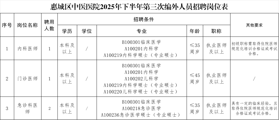 现根据工作需要,按公开、平等、竞争、择优的原则,惠州市惠城区中医医院决定面向社会公开招聘一批工作人员,现将有关事项公告如下: