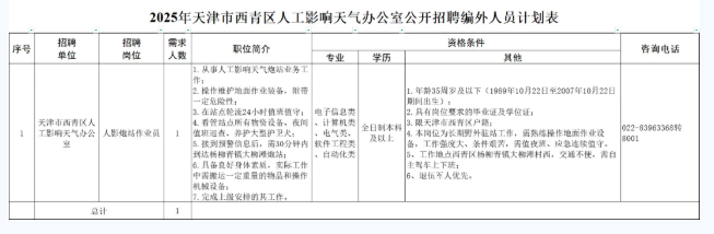 7.具备招聘岗位所规定的其他条件,详见《2025年天津市西青区人工影响天气办公室公开招聘编外人员计划表》。