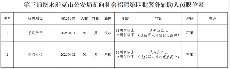 具体岗位详见《2025年第三师图木舒克市公安局面向社会招聘第四批警务辅助人员职位表》(附件1)。