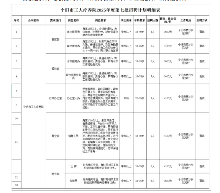 因工作需要,遵循“公开、平等、竞争、择优”招聘原则,个旧市工人疗养院委托个旧市大众事务服务管理有限公司面向社会公开招聘工作人员27人。现将有关事项告知如下: