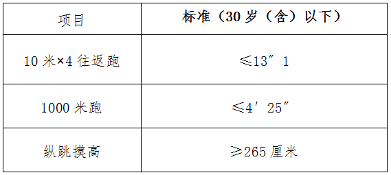 参加体能测评的人员为笔试考试成绩合格的考生。体能测评的标准,参照《关于印发公安机关录用人民警察测评项目和标准(暂行)的通知》(人社部发[2011]48号)的标准,具体如下: