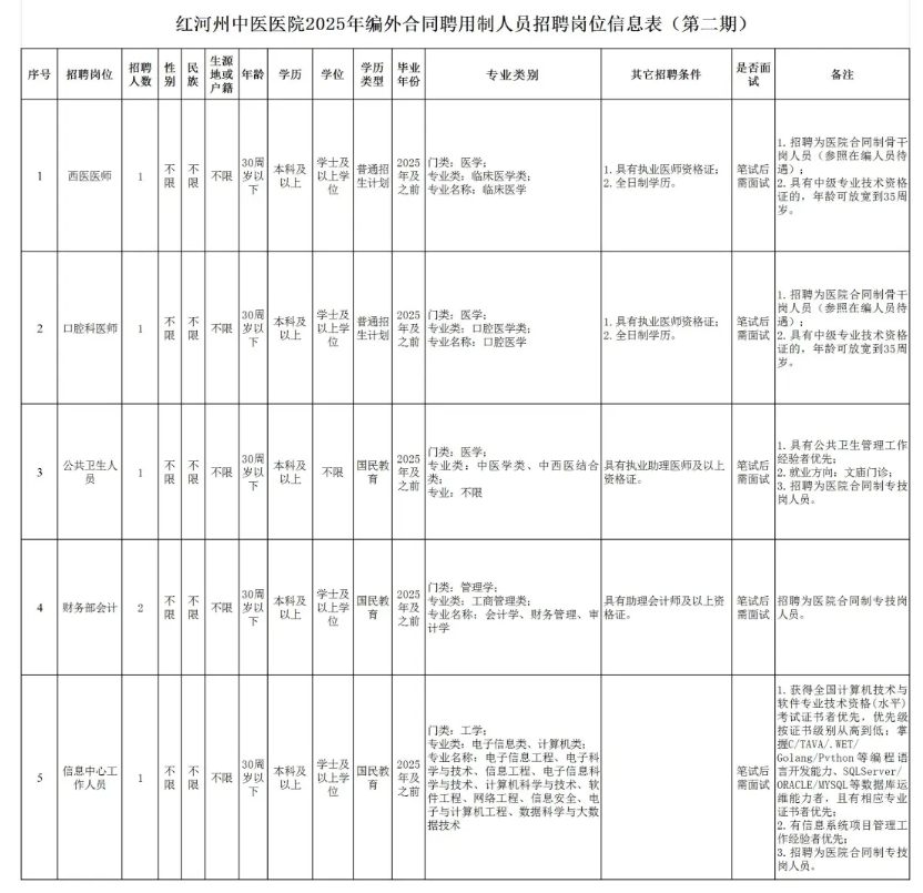 凡符合条件的人员均可报名参加此次公开招聘。具体详见《红河州中医医院2025年编外合同聘用制人员招聘岗位信息表(第二期)》(附件1),专业类别详见《普通高等学校本科专业目录(2024年)》(附件2)、《研究生招生专业、代码册(2022年)》(附件3)。
