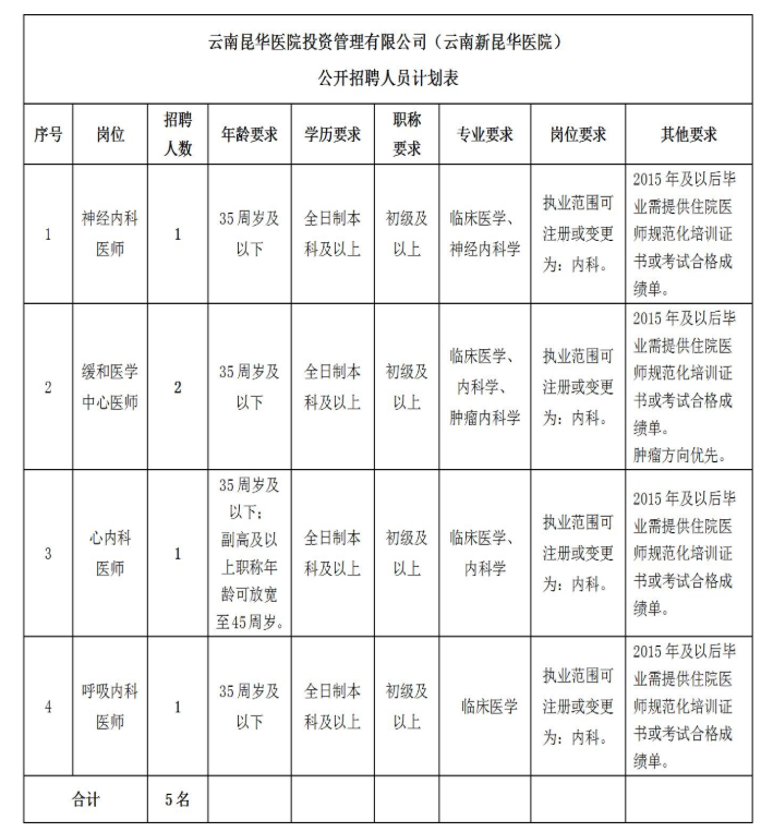云南昆华医院投资管理有限公司(云南新昆华医院)本次公开招聘4个岗位,共招聘工作人员5名,具体详见下表: