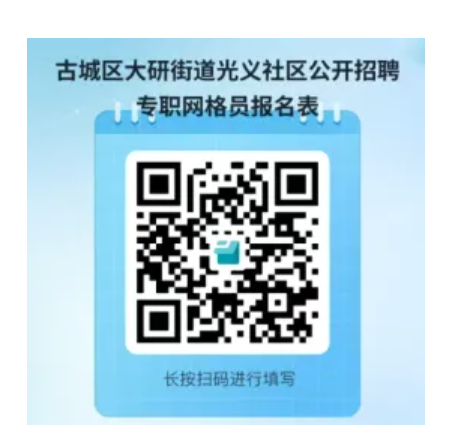 2、报名方式:采取线上报名。请扫描《古城区大研街道光义社区公开招聘专职网格员报名表》二维码,按要求如实填写并提交相关信息。