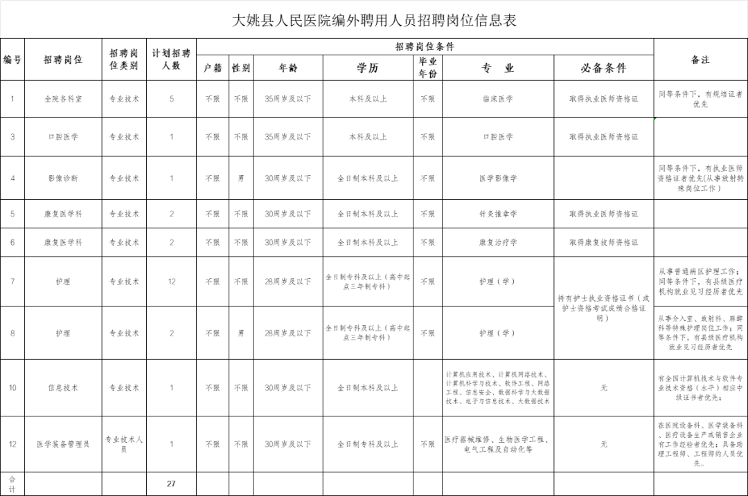 为进一步加强大姚县人民医院人才队伍建设,不断提升县域医疗服务能力,满足人民群众对健康服务的需求,经研究并报县卫生健康局同意,决定面向社会公开招聘编外聘用人员27名,现将有关事项公告如下: