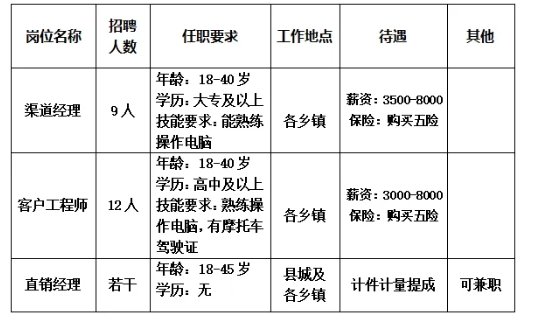 云南邮电工程有限公司富宁片区因业务发展需要,现面向社会公开招聘渠道经理等岗位人员派驻中国电信富宁分公司工作,现诚邀有志之士加入,与公司共同发展。