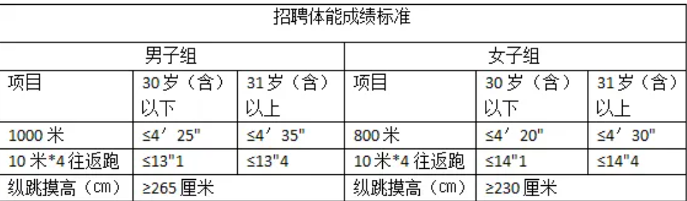 体能测试参照《公安机关录用人民警察体能测评项目和标准(暂行)》开展,项目为1000米(男)/800米(女)、10米*4往返跑、纵跳摸高三项。
