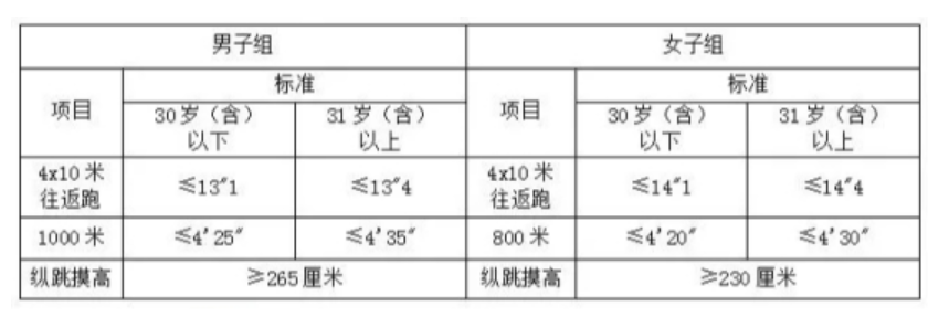 (2)体能测试参照《公安机关录用人民警察体能测评项目和标准(暂行)》开展,测试项目为纵跳、4×10米往返跑、1000米(男)或800米(女)长跑三项(合格标准如图)。体能测试所有项目成绩均合格者入围面试环节;若有某个单项未达到合格标准的,则不能进入面试环节;若某岗位所有体能测试人员均有某个单项未达到合格标准的,则该岗位取消;