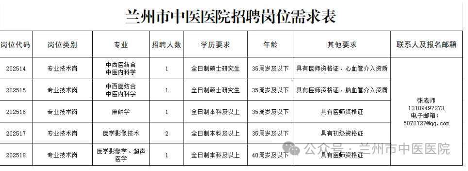 本次计划招聘编外专业技术人员5个岗位6人,具体岗位详见《兰州市中医医院招聘岗位需求表》。