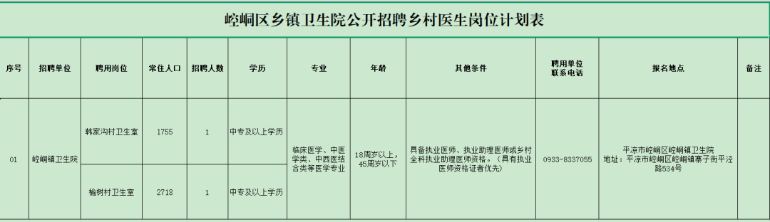 附件1-崆峒区乡镇卫生院公开招聘乡村医生岗位计划表.xlsx