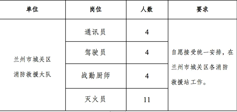 (三)工作地点:新聘用人员在参加入职岗前教育培训并考核合格后,根据工作需要,分配至兰州市城关区消防救援大队下辖的各消防救援站工作。