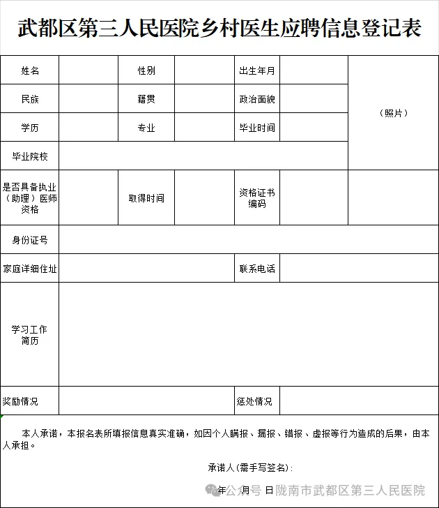 4.资格审查:应聘人员报名填写《武都区第三人民医院乡村医生应聘信息登记表》后,由武都区第三人民医院进行资格审查,资格审查不合格的取消报名资格,资格审查合格的由医院统一安排进行考试。注意:报名填写的联系方式是应聘人员联系的重要途径,应聘人员需保证手机畅通且中途不得更换联系方式,如因错填、中途更换联系方式、手机欠费、不在服务区、信息拦截、信息删除等个人原因导致无法参加考试的,所产生的一切后果由本人承担。
