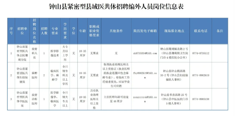 5.岗位具体信息及要求详见附件1《钟山县紧密型县域医共体招聘编外人员岗位信息表》(如下图)。
