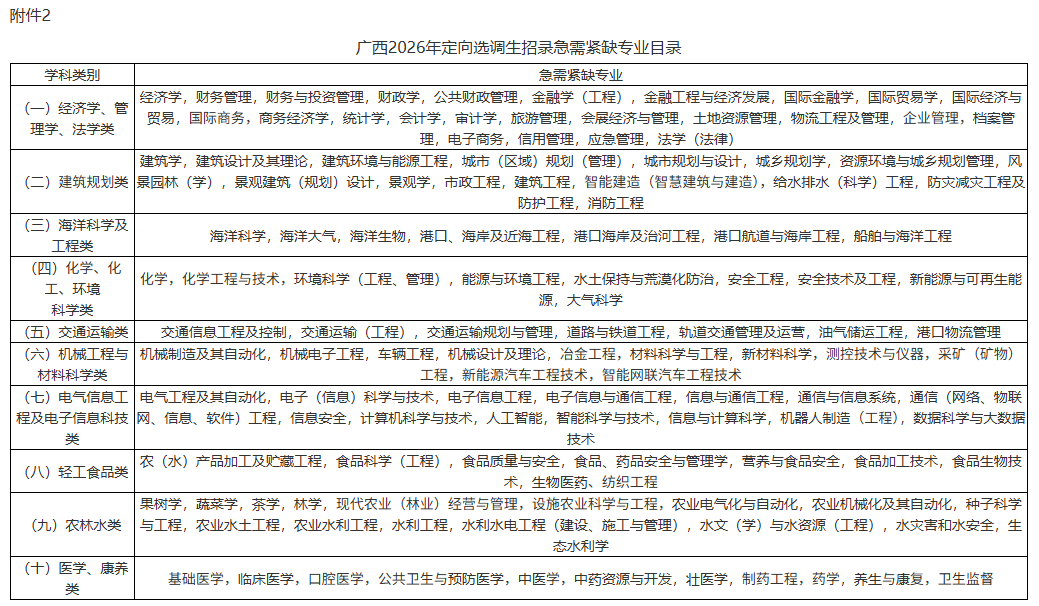 (六)符合广西2026年定向选调生招录急需紧缺专业(详见附件)或现就读高校国家“双一流”建设学科相关专业。法学专业的在报到时须获得国家法律职业资格证书(A证)。志愿到县乡机关工作的,不限专业报考,也不要求获得国家法律职业资格证书(A证)。校级学生会(研究生会、社团联合会)主席、副主席、各部部长、副部长,校团委副书记、各部部长、副部长,院系学生会(研究生会)主席、副主席、团委副书记,也不限专业报考。