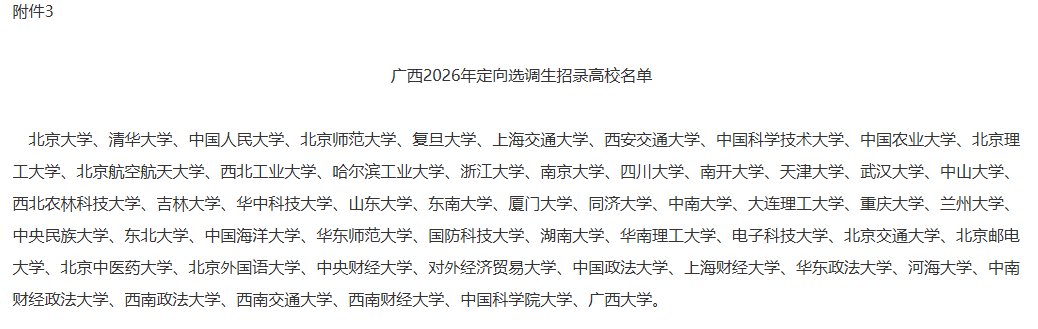 中国科学技术大学2026年全日制大学本科及以上学历应届优秀毕业生(本科生、硕士研究生须在2026年7月31日前取得毕业证书和学位证书;博士研究生须在2026年12月31日前取得毕业证书和学位证书)。高等教育阶段属于定向培养(可到广西工作的除外)、委托培养、在职培养、自学考试、网络学院、成人教育学院、专升本、独立学院、民办院校的毕业生,不列入选调范围。