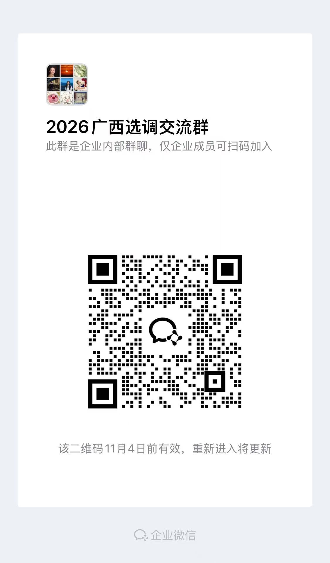 步骤1:扫描本公告的二维码,进入“2026广西选调交流群”企业微信群,若二维码失效,请添加工作人员微信:lswygood,备注“学院+姓名+广西选调”。