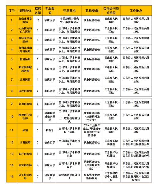 本次招聘是田东县人民医院医共体总院根据总院、各分院的人才需求情况统一招聘,被录用人员根据具体工作地点与相应分院或总院签订劳动合同,被录取人员的薪酬、福利待遇由相应的分院或总院按同类型人员发放。具体招聘岗位详见附件:《2026年田东县人民医院医共体招聘计划表》。