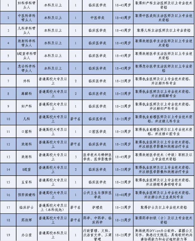 5.年龄要求年满18周岁以上35周岁以下;中级以上职称年龄放宽45周岁以下;高级职称年龄放宽50周岁以下。(年龄计算截止时间为发布之日)。