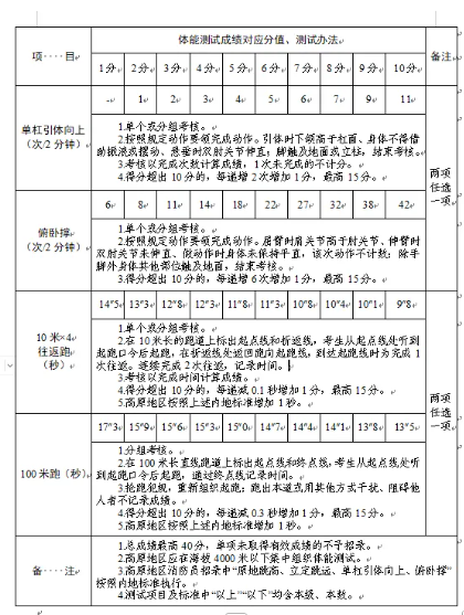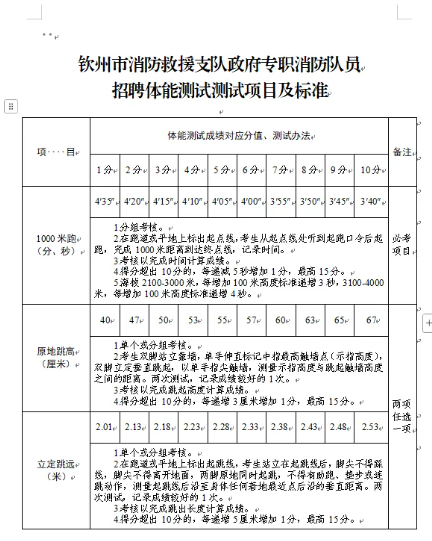 2.体能测试:(1)必考项目:1000米跑;(2)选考项目:①立定跳远、原地跳高二选一;②单杠引体向上、俯卧撑二选一;③10米×4往返跑、100米跑二选一;(3)注意事项:应聘人员须参加体能测试,并当场签订《体能测试健康安全风险承诺书》,体能测试有两项及两项以上不得分的视为不合格(标准参照附件)。未按时参加或因身体原因无法测试者,视为自动放弃。(体能测试测试项目及标准附后)