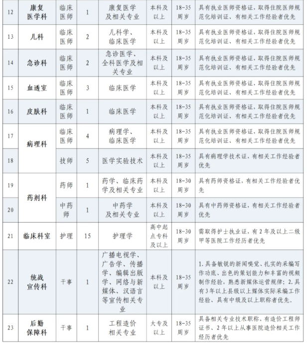 (三)学历及资质要求:具备相应的学历,各专业技术岗须取得相应的执业准入资格或专业技术资格;