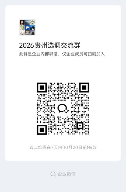 1.扫描本公告的二维码,进入“2026贵州选调交流群”企业微信群,若二维码失效,请添加工作人员微信:wy_20030316,备注“学院+姓名+贵州选调”。
