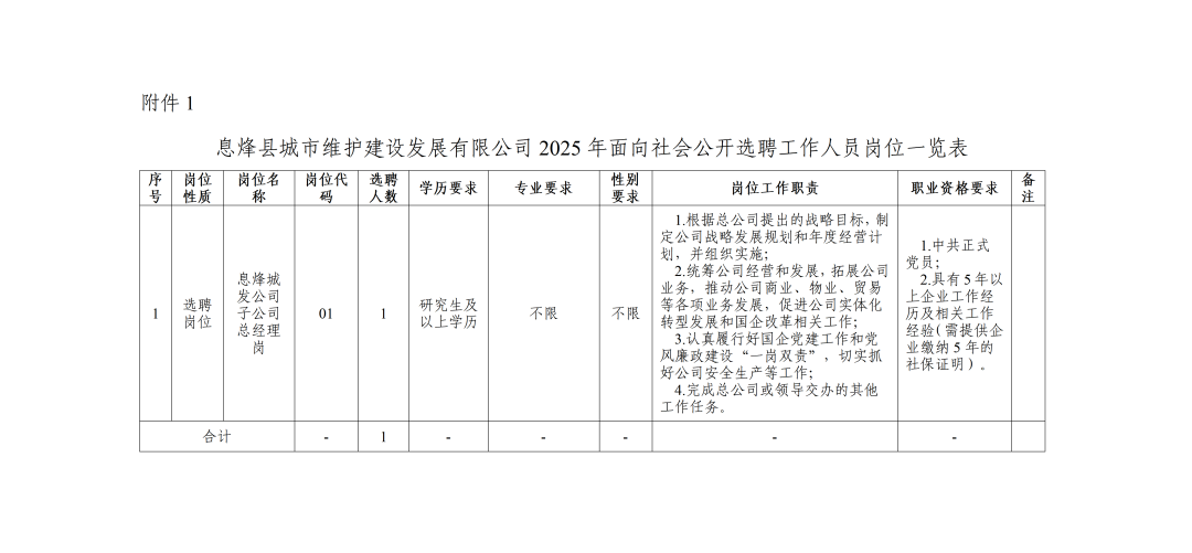 本次面向社会公开选聘息烽县城发公司下属子公司息烽城市运营维护管理有限公司总经理1人。具体岗位及条件详见《息烽县城市维护建设发展有限公司2025年面向社会公开选聘工作人员一览表》(以下简称《岗位一览表》)。