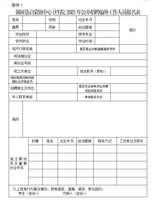 地点:锦屏县启蒙镇中心卫生院综合楼五楼(联系电话:黄院长13688555529;龙主任13985287532)。考生根据所报岗位要求填写《锦屏县启蒙镇中心卫生院2025年公开招聘工作人员报名表》(附件1),并提供以下材料原件和复印件(复印件由报名点留存),在规定时间内到指定报名点报名。
