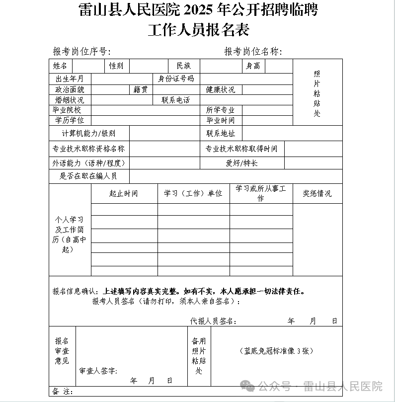 报考人员直接到报名现场领取《雷山县人民医院2025年公开招聘临聘工作人员报名表》(附件2)(以下简称《报名表》)如实填写本人有关信息。