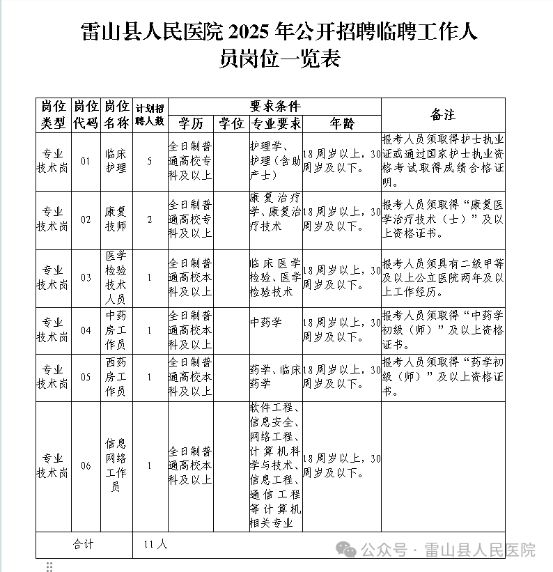 具体招聘岗位及人数详见《雷山县人民医院2025年公开招聘临聘工作人员岗位一览表》(附件1)。
