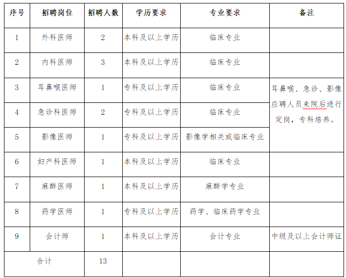 此次计划招聘医务人员13名。具体岗位、人数等详见下表: