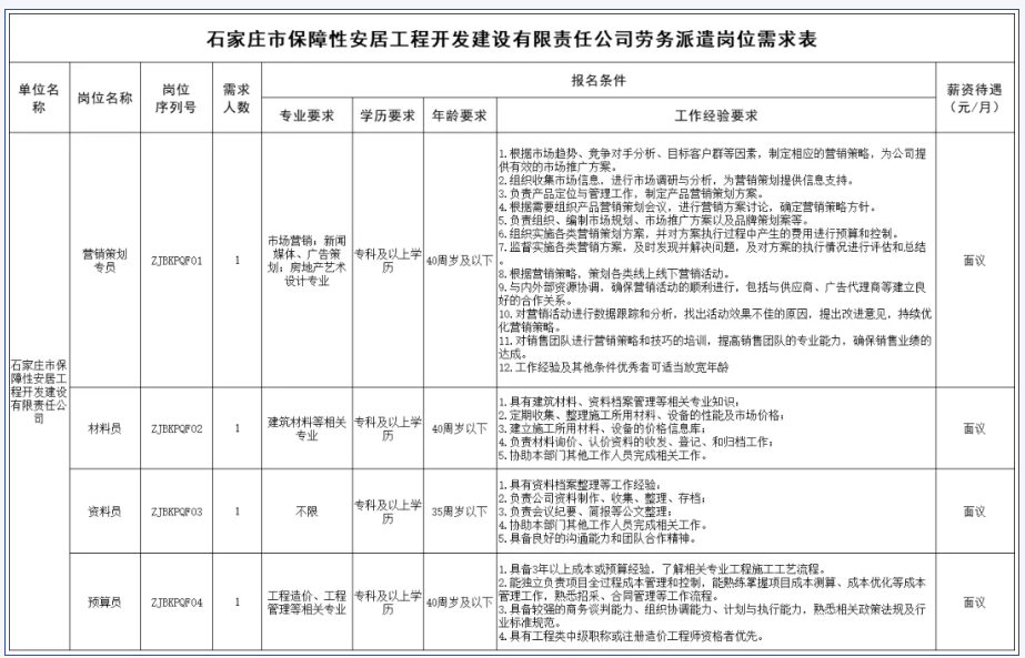石家庄市保障性安居工程开发建设有限责任公司劳务派遣制人员招聘