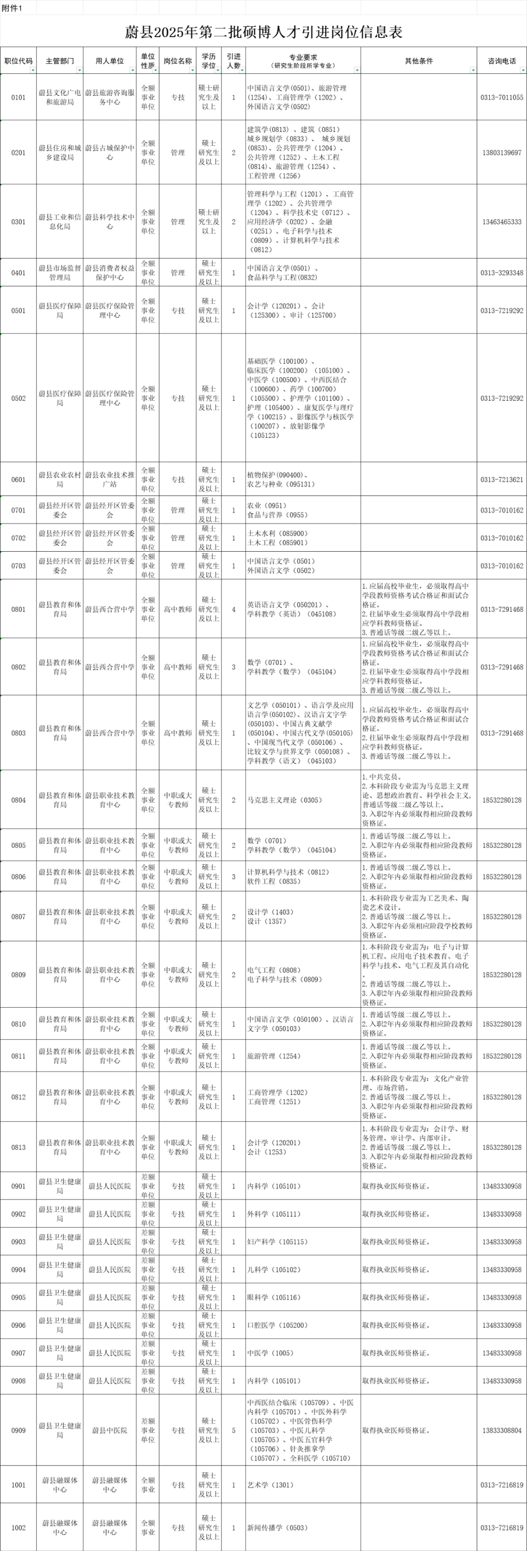 蔚县2025年第二批人才引进事业编硕博人才50名,详见《蔚县2025年第二批硕博人才引进岗位信息表》。
