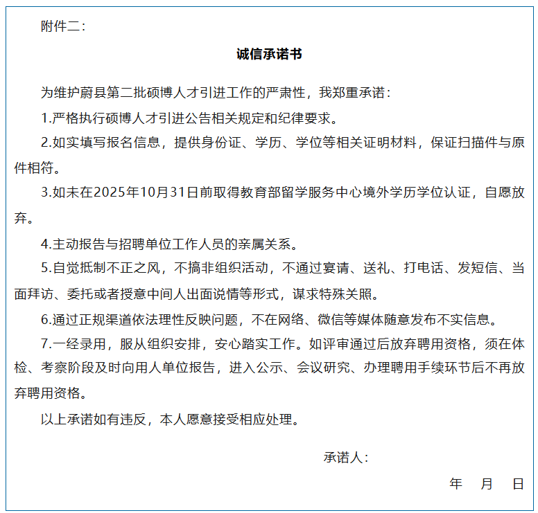 报名程序及注意事项:(1)考生开始报名前,须完全了解本次招聘政策和拟报考岗位条件,认真阅读《蔚县2025年第二批硕博人才引进公告》并同意《诚信承诺书》。